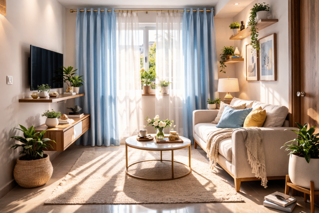 In compact rooms, every visual element matters. Curtains occupy large vertical surfaces, which means they strongly influence how the eye perceives space.