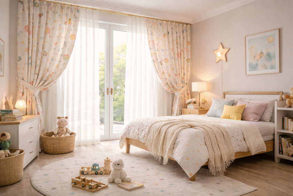 Kids rooms need fabrics that are safe, durable, and visually engaging. Fun prints and soft textures make the space lively while staying practical.